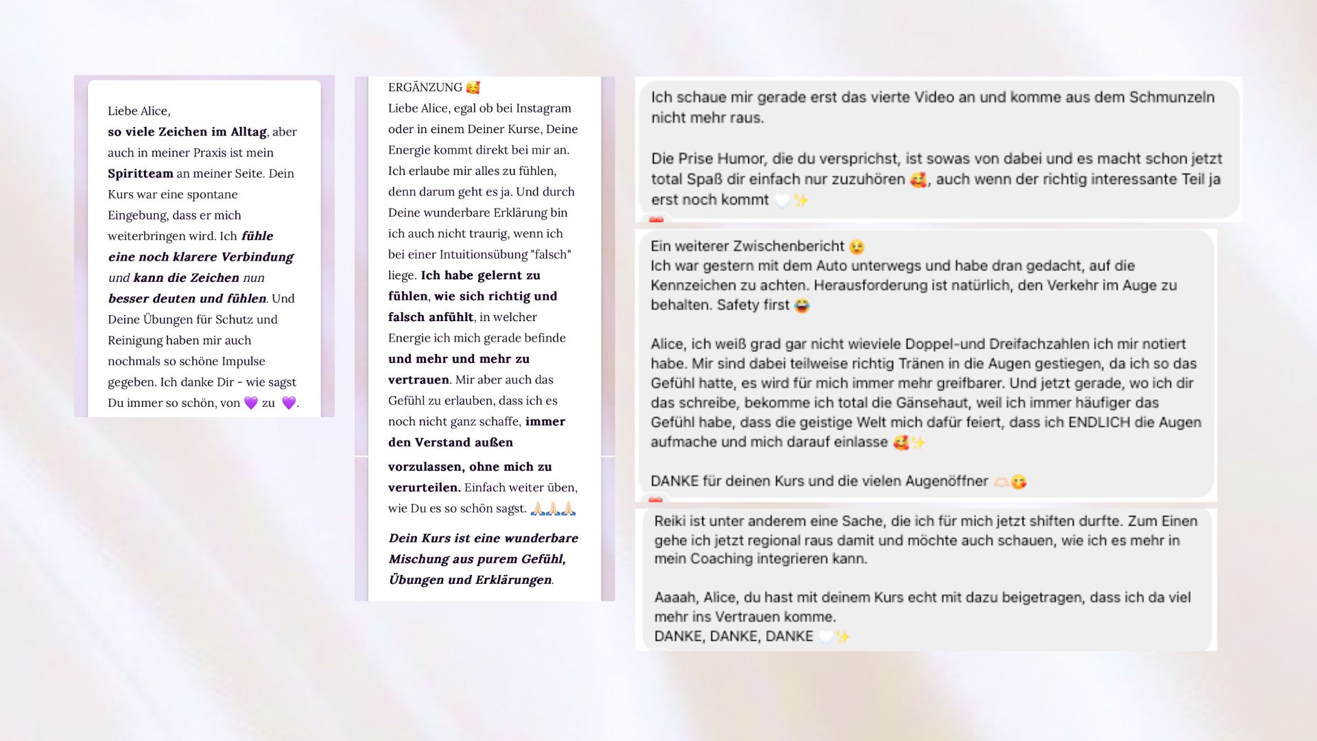 "... Seitdem ich deine Videos angefangen habe, sehe ich nur noch Engels- und Doppelzahlen. Ich gucke, wie spät es ist und dann schon wieder … Das muss wirklich sehr transformierend werden, dein "Kurs" für mich. Ich weiß nicht, wie ich es anders ausdrücken soll. Dafür, dass ich erst gezögert habe, bin ich jetzt doch echt mega froh, dass ich das angefangen habe und bin gespannt, wie meine Reise noch weitergeht. Also, vielen lieben Dank für den "Kurs". Ich finde den bisher richtig mega, auch deine Art, ich muss manchmal schon immer mitlachen, obwohl ich nicht dabei gewesen bin. Und auch deswegen bin ich total froh, dass ich es gemacht habe. Also noch mal einen lieben, lieben Dank dafür..."